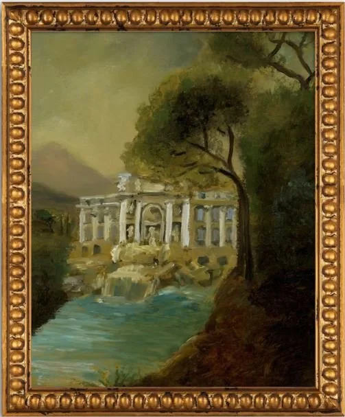 “Framed Trevi Fountain” is an original oil painting featuring the Trevi Fountain reimagined flowing into a river in the Italian countryside.